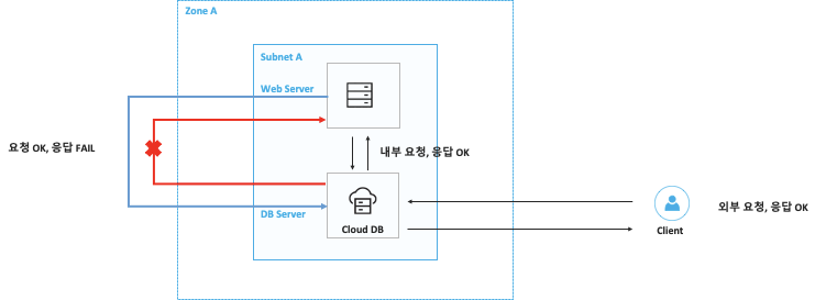 나 같은 경우 동일한 서브넷에 DB와 VM이 생성되어 있었기 때문에 src -> dst -> src 과정 중 dst -> src 갈때 src 인바운드에서 차단되었고, 그렇기 때문에 아예 NACL의 영향을 받지 않는 외부나 Private 도메인에서의 내부 접속은 정상적이었으나 Public 도메인 접속 시 Time Out이 발생하였던 것이었다.