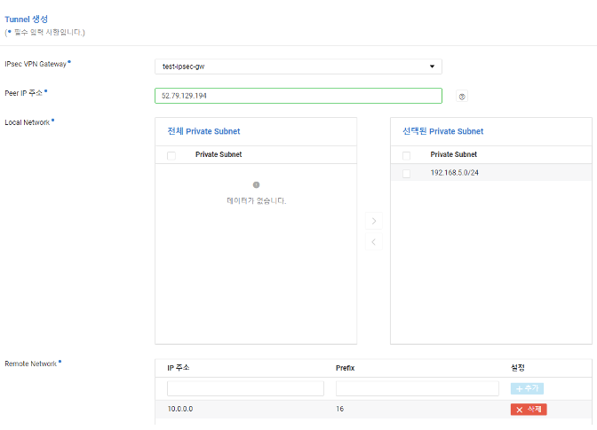- NCP 콘솔에서 AWS 의 터널 IP를 이용하여 터널링을 맺어줘야 한다. 연결을 하게 될 AWS의 퍼블릭 IP와 서버 대역을 입력해주고, 2단계 IKEv1 Policy를 구성정보와 일치하게 입력해준다.