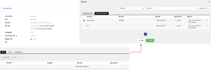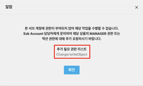 사용자 정책을 연결한 서브계정으로 접근 시 리소스 허용하지 않았던 항목에 대해서는 사용이 불가능한 것을 확인할 수 있다.