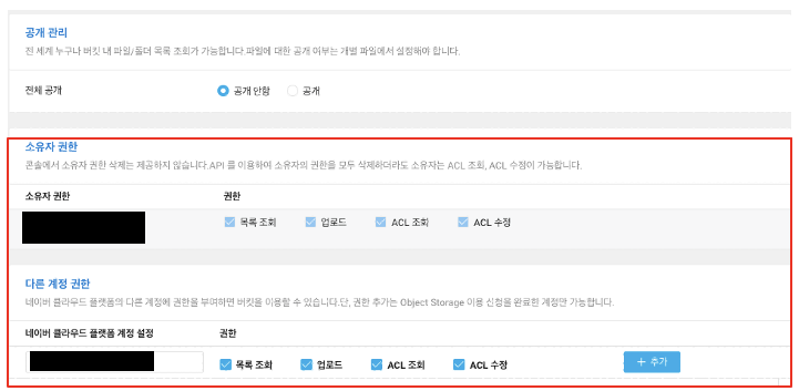 Object Storage 버킷 권한 관리를 눌러보면 아래와 같이 기본적으로 소유자 권한 관리 및 다른 계정 권한에 대한 부분을 추가 및 확인 할 수 있다.