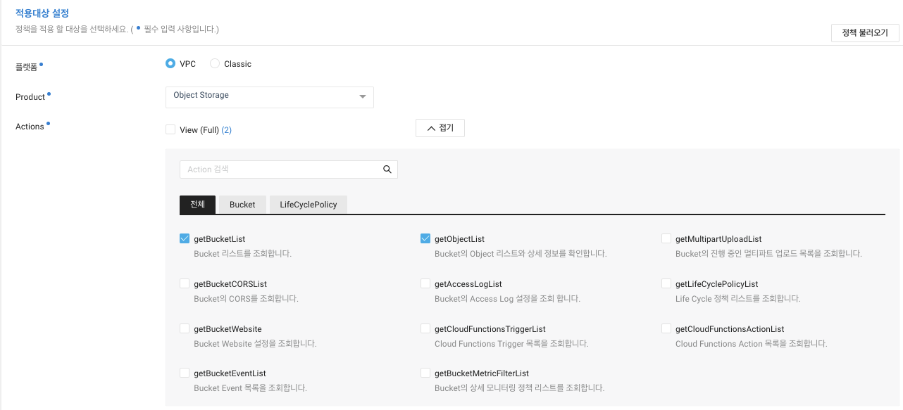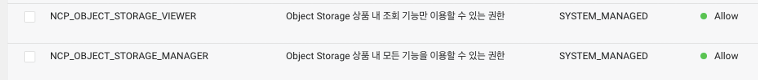 * Object Storage 버킷을 서브 계정에서 이용할 때는 기본적으로 해당 서브계정에 Object Storage 관련 정책이 설정되어야한다.